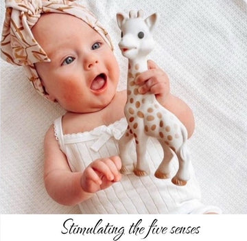 The gentle squeak helps stimulate baby’s hearing and provides an early lesson in cause and effect. Babies learn that squeezing Sophie creates sound, which adds to her playful charm.