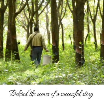 Natural rubber comes from the hevea trees. Each morning, at dawn, traditional growers extract the rubber from the tree by tapping its bark.