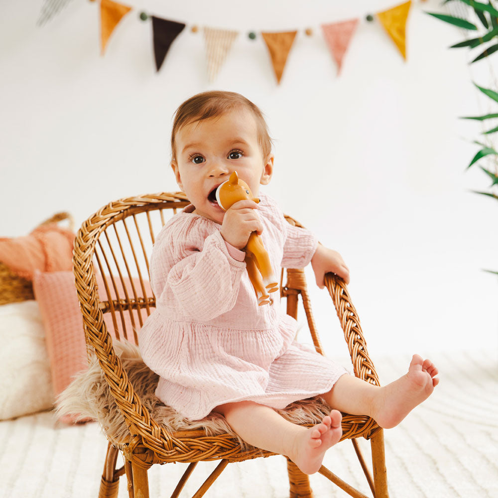 Lightweight and carefully proportioned, Fanfan’s long neck and legs make it easy for newborn hands to grasp and hold. Its unique natural rubber scent offers familiarity and reassurance—making Fanfan a cherished companion as well as a teether.
