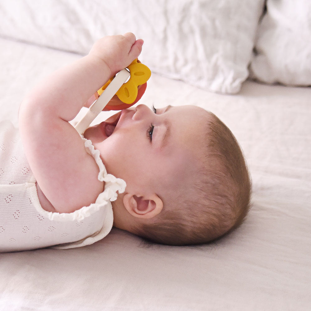 Perfectly sized for newborn hands, the Fragrance Ring is lightweight and easy to grasp. The softly scented medallions provide gentle olfactory stimulation while doubling as a comforting teether—encouraging sensory discovery and providing relief during teething.