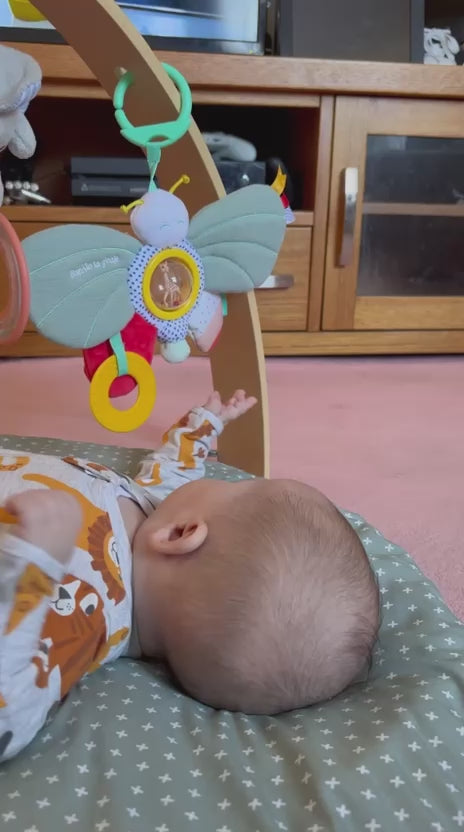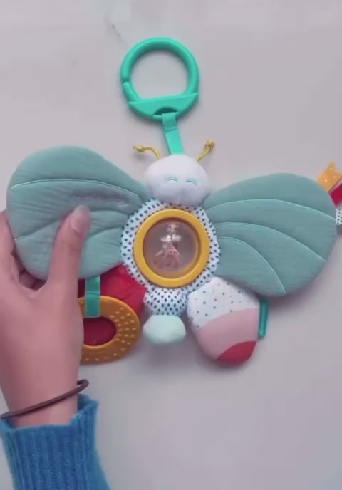 This developmental companion features bright colours, varied materials, a soothing teething ring, crinkly textures, and hidden sounds—perfect for encouraging tactile and sensory exploration and developing fine motor skills. It supports play through touch, sight, sound, and taste.