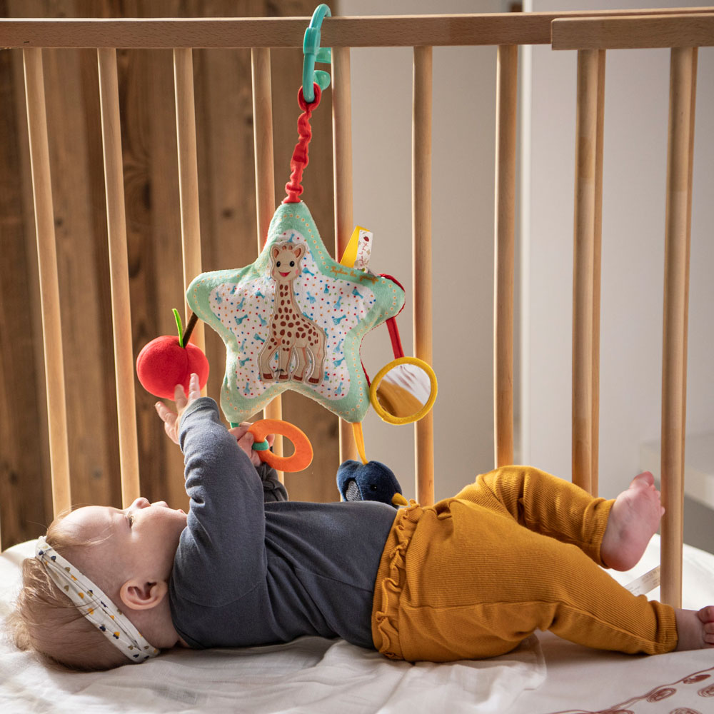 The Sophie la girafe Star Activities is a sensory star designed to stimulate baby’s senses through play and comfort. This charming toy features bright colours, crinkle paper, and soft textures like corduroy, micro-velvet, and felt. It includes a teething ring, gentle bells, and a small mirror for visual play.